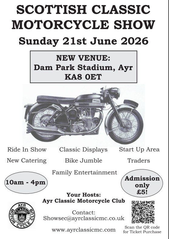 Ayr Classic Motorcycle Club is proud to organise the Scottish Classic Motorcycle Show. This iconic show commenced in June 1989 at Dam Park Hall in Ayr. Over the last 36 years it has developed and moved home as it grew. We utilised Centrum Ice Rink, Prestwick, until it was demolished, then moved out of Ayr to Rowallan Equestrian Centre, Fenwick, before returning to Ayr in 2011 to the Princess Royal Function Suite at Ayr Racecourse. This Year’s Show will return to its roots, well almost! This year the Show will be at Dam Park Stadium, Ayr, KE8 0ET and is returning to a Sunday show. This year it will be on Father’s Day which is 21st June 2026.
